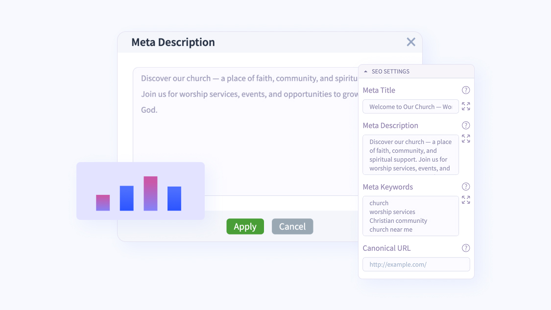 The right title tag is like a front door with a clear sign. It’s the first thing Google reads and the first impression your visitors get. We craft titles and descriptions that attract clicks, improve ranking, and align perfectly with your church’s core message.